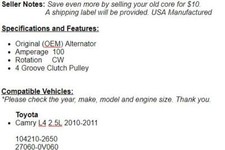 Alternator : V6, 3.0L. 100AMP/12Volt CW ,6-Groove Pulley. TOYOTA Sienna. This Toyota High Output Alternator is perfect for V6, 3.0L. 1MZFE Engine. O. E. M. Parts. Alternator - Denso IR/IF. A Professionally Re-manufactured Alternator.
