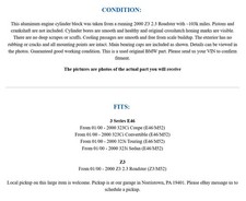 Block has some surface rust and some scoring on a few cylinders. Should clean up with. 010 over. This will work in any 03-07.5 ram or common rail 5.9 industrial application. No warranty or returns what you see is what you will recieve. Mains and main bolts are included Freight shipments must be sent to a business address with the ability to unload a truck. Please send zip code prior to purchasing and i will revise the listing to accurate Freight costs. Alot of the times its cheaper than advertised.