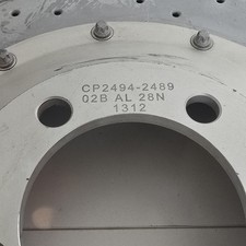 Item: Drilled two-piece vented automotive brake disc rotor. Part number stamped on the hat: CP2494-2489. Additional hat markings: 02B AL 28N and 1312. Construction: Aluminum center hat bolted to a cast iron drilled rotor ring. Rotor style: cross-drilled and internally vented design for enhanced cooling performance. Color: natural silver/gray metal finish with visible wear on the braking surfaces. Number in pack: one rotor only; no pads, mounting hardware kit, or additional components included. Suitable as a replacement or spare where this specific part number is required; buyer should verify compatibility with their vehicle or application before purchase. Sold as shown without original box or documentation.