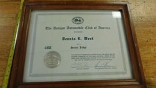VERY NICE AND EXTREMELY HARD TO FIND ORIGINAL AACA SENIOR JUDGE VERTIFICATE. THESE WERE FROM A VERY WELL KNOWN AACA MEMBER AND JUDGE WHO SPENT HIS LIFE RESTORING AND PERFECTING HIS COLLECTION OF VEHICLES, THIS IS AN ORIGINAL TROPHY PLAQUE FROM HIS COLLECTION. ALL ORIGINAL AND READY TO ADD TO YOUR COLLECTION. FEEL FREE TO ANY QUESTIONS. BE SURE TO CHECK OUR OTHER AUCTIONS FOR MANY OTHER HARD TO FIND VINTAGE TROPHYS AND OTHER AACA ITEMS. ALWAYS HAPPY TO COMBINE SHIPPING ON ORDERS. FORDBUILDINGSHELFQ TROPHYLOT.