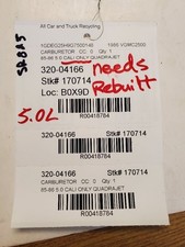 Carburetor 8-305 5.0L California Fits 85-86 CHEVROLET 10 PICKUP Sold As a Rebuildable Core Gaskets Dried Out From Sitting Will Leak If Just Bolted On ! NEEDS REBUILT ! 85-86 5.0 CALI ONLY QUADRAJET Carburetor 8-305 5.0L California Fits 85-86 CHEVROLET 10 PICKUP.