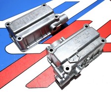 This is a pair of old model side hung fuel bowls for Holley vacuum secondary carburetors. Cleaned, inspected, vapor honed, and refinished with a satin silver color. Includes the correct accelerator pump cover (mounting screws are new).