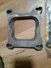 Aluminum four barrel carburetor spacer with new gasket measures about 6 in by 6.5 in square intake inside diameter about 3 and 3/4 in and on the smaller side 3.5 in roughly this probably came off a Pontiac but I can't remember it will work on others free gasket included free shipping fast free shipping from Oregon USA