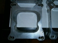 4 Assorted Carburetor Open Center Adapter Spacer Plates, 1 Mr. Gasket and 3 unbranded, all 4 are 3/4 inch tall, all 4 have the same bolt pattern, 5-5/8 in x 5-1/8 in (outside holes) and 5-5/8 in x 4-1/4 in (inside holes), all are aluminum, in drivers condition with a couple of them needing some wire brush or solvent type cleanup just remove some scale and grime, multiple carburetors will fit these for multipurpose uses, I believe these will work for spread bore and square bore,will be wrapped and boxed carefully.