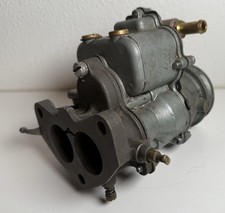 The carburetor fits an early 50's Chevrolet, GMC 235 ci inline 6 cylinder engine. Carburetors may also fit early 50's 261 ci engines. It shows signs of use and may have defects, though the issues are not severe.