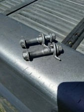 Pair of #12.9 grade SPC camber bolts, pulled from an 08 Kia Rio. Includes (2) bolts, their indexed washers, hex nuts and eccentric cam lobes. You can use these in place of your OEMs on the top strut holes to achieve fine camber adjustments +/- 1.75 degrees, normally made impossible (ie. fixed position from factory with OEM bolts).