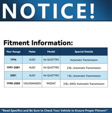 AUDI A4 QUATTRO 1996 Automatic Transmission. AUDI A4 QUATTRO 1997-2001 2.8L; Automatic Transmission. AUDI A4 QUATTRO 2001 1.8L; Automatic Transmission. VOLKSWAGEN PASSAT 2000-2005 2.8L; AWD; Automatic Transmission.