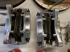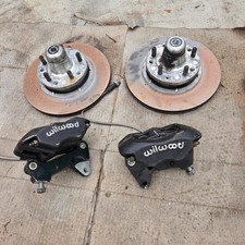 This is a used front set of Aerospace Components 4 piston heavy duty brakes with a pair of 87-93 Mustang V8 front spindles drilled and tapped per the instructions from Aerospace. Lug pattern is standard Mustang 5 on 4.5 with 3" long 1/2-20 studs.