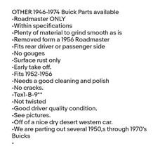 OTHER 1946-1974 Buick Parts available. •Fits rear driver or passenger side. •Good driver quality condition. •No gouges. •Not twisted. •Tex1-B-9 . •No cracks. •Needs a good cleaning and polish.