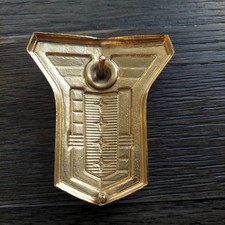 The product is a vintage 1949-1950 Mercury hood nose ornament emblem in gold color, made in the United States. This bolt-on emblem is designed for the front hood of a car and features a chrome finish. It is a genuine OEM part suitable for Mercury vehicles from the specified years. This rare and collectible emblem adds a touch of classic style to any vintage Mercury car.