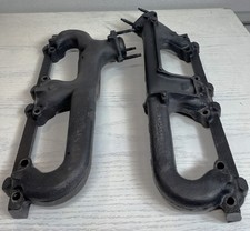 A pair of factory cast iron exhaust manifolds used on Gen 1 Chevrolet Small Block engines from 1973 to 1981. The manifolds are black in color and are designed as a left and right exhaust. The part number was ground off of the driver side manifold, so my best guess is #361963. The passenger side manifold is #348248.