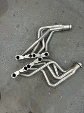 Used needs a good cleaning 1 5/8 fits 67 Camaro with power steering and no AC I had a Lares power steering box and it cleared but other aftermarket boxes may need clearance. Just and fyi as buying as is no returns Passenger side had a O2 sensor bung welded on it