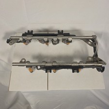 A used fuel injection rail with regulator off of a 1996 Ford F150 with the 5.0L V8 engine.