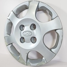 Here is an original hubcap for the 2001-2003 Hyundai Elantra. It is in average condition with typical wear and tear / scratches and obvious paint peel issues. The one shown is the actual one you will get.