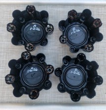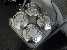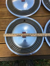 This is for a set of 4 used rim hubcap covers. Each one has some wear to the coloring and metal. Dings and dents and some discoloration where metal oxidized from storage. Clean before use. See all photos for full condition details. All items are purchased second hand and may have been around pets and or smoking. May contain odors.