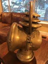 Antique Brass C.M. HALL Model 115 Car Lantern. The base is bent the lantern still sits up. The lens is cracked and is still solid. The lantern is very nice with handle. The burner inside is intact and has a wick.
