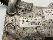 The product is an OEM Audi automatic transmission oil cooler designed for use in Audi A6 and A7 models from 2012 to 2015. Made of aluminum, this oil cooler is manufactured by Audi with part numbers 4H0317021 and 4H0317021H.