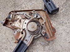 This parking brake was sandblasted and repainted with high heat cast iron paint. It has a date code of 1033. The tension spring is located at the top of this parking brake. The parking brake handle and the rubber pad are in used condition.