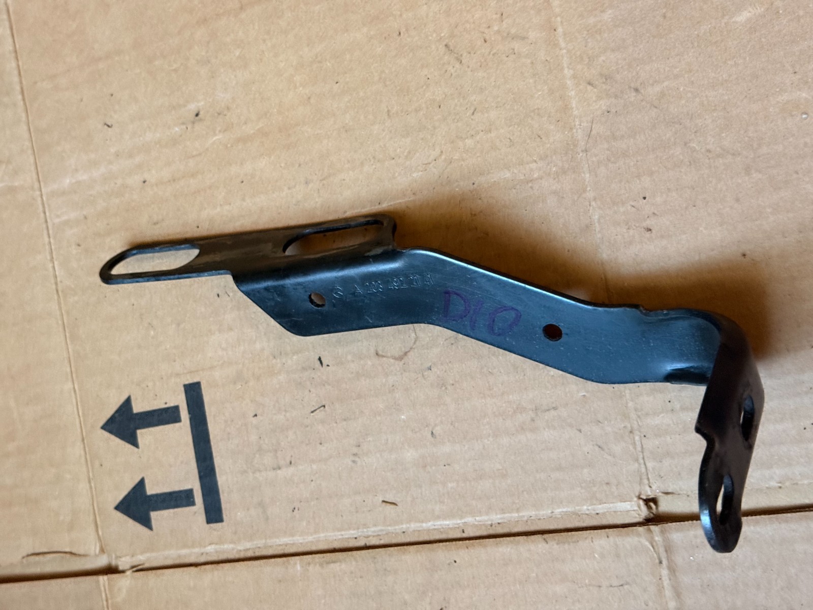 The product is a left bracket for the transmission exhaust hanger on Mercedes W203 models from 2001 to 2007. It is an authentic Mercedes-Benz part made in Germany, specifically designed for a sedan with the manufacturer part numbers C240 and SK56. The bracket is crucial for holding the exhaust hanger in place and ensuring proper positioning for optimal performance and appearance. It comes as a single piece as shown in the listing.