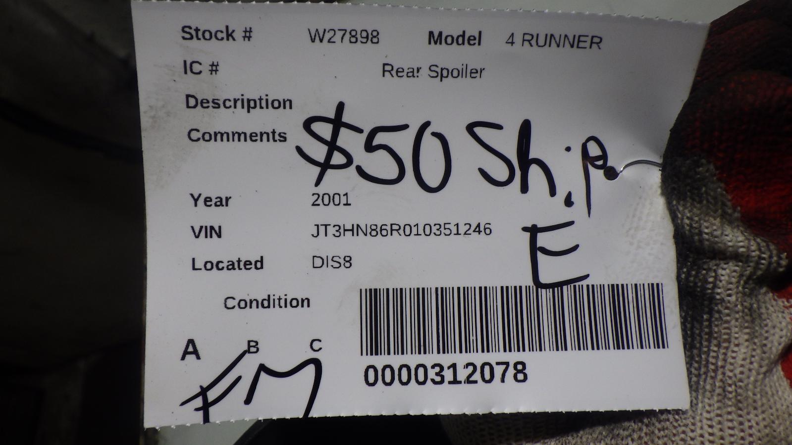# 4 RUNNER2001 ### IF YOU ARE FROM ALASKA, HAWAII, PUERTO RICO YOU MUST REQUEST A SHIPPING QUOTE. STANDARD SHIPPING DOES NOT APPLY TO YOU. ## Item Details Make / ModelTOYOTA 4 RUNNERYear2001Stock NumberW27898VINJT3HN86R010351246Odometer0 Miles km ## Part also fits ## General Information and Conditions - West Coast Auto - Feel free to contact us in regards to any purchase or if you simply need more INFO ## Shipping and Handling - Ship To Locations Our default shipping rates are for the 48 US states only via UPS Ground or USPS. At an extra charge, Alaska , Hawaii , APO, FPO, Puerto Rico and all US Territories will be sent via USPS Priority Mail. At an extra charge, we will also ship items World Wide International via USPS International Priority mail. Depending on which country you are in, you may need to contact us for a shipping quote before or after purchase to complete the sale. We usually ship within 1-2 business days of receiving cleared payment. Unless otherwise noted, Buyer pays shipping. Freight Items We will not ship freight items and some larger or fragile parts outside of the 48 US states. For large items that must be shipped via Freight Truck (i.e. engines, transmissions, doors, trunks, hoods...etc), the delivery site must be a commercially zoned address capable of unloading a freight truck. Home businesses, churches, military bases, schools, and self storage units cannot be delivered to. We can also arrange for you to pick up your freight item at your local freight terminal. For an accurate residential freight quote, please contact us before your purchase. If for some reason our shipping cost is greatly over this estimate, we reserve the right to ask for additional funds or an alternate ship to address. Shipping Deadlines We will process every order within 24 hours of checkout. Our business hours are from 8-5 M-F PST. Orders placed after 1:00 pm PST cannot be guaranteed shipping that day. All Non-Freight items will be sent via UPS or USPS ground unless given instruction otherwise. If you need 2nd day air or Next day air service please call us directly for best results. You may also add this service during checkout but we can only guarantee shipment of these orders if it is placed before 1:00 PST. All freight items will go out the same day if pulled and the order is placed before 12:00 noon PST. This is providing that we have adequate payment, shipping instructions and phone numbers to process the shipment. ## Payment - We accept Pay Pal, or most major credit cards. If you want to use a personal credit card you can pay through our checkout or please Google us to contact us, 8-5 PST M-F By law, we charge sales tax for items shipped to these states(CALIFORNIA): (8.00%). Tax applies to the subtotal plus any shipping and handling for these states only. No labor warranty is provided. In the event a part sold with a warranty fails to operate within the warranty period we will replace the part(s) with a functionally equivalent part or refund the part purchase price, at our option. No refund on deposits or unwanted special order parts or special "cut" items. To return an item you must contact us within the 14 day period to obtain a RMA number (return material authorization). Original shipping charges and return shipping charges are not refunded. Once you obtain an RMA number, ship the item back to WEST COAST AUTO DISMANTLING, (Google us for info) along with the RMA number. - Parts Covered by Warranty – in case the part sold fails to work due to defective material or wrong fitment, we will replace the part or issue a full refund (our choice) up to the cost of the part purchased price (no refunds for labor costs), see warranty tab in the listing for more details. - Items NOT Covered by Warranty - For parts that are not defective, but are returned, the following will apply: 20% Restocking Fee, shipping costs are not refunded, and customer pays for shipping the part back ## Item Location and Contact Information West Coast Auto Dismantling