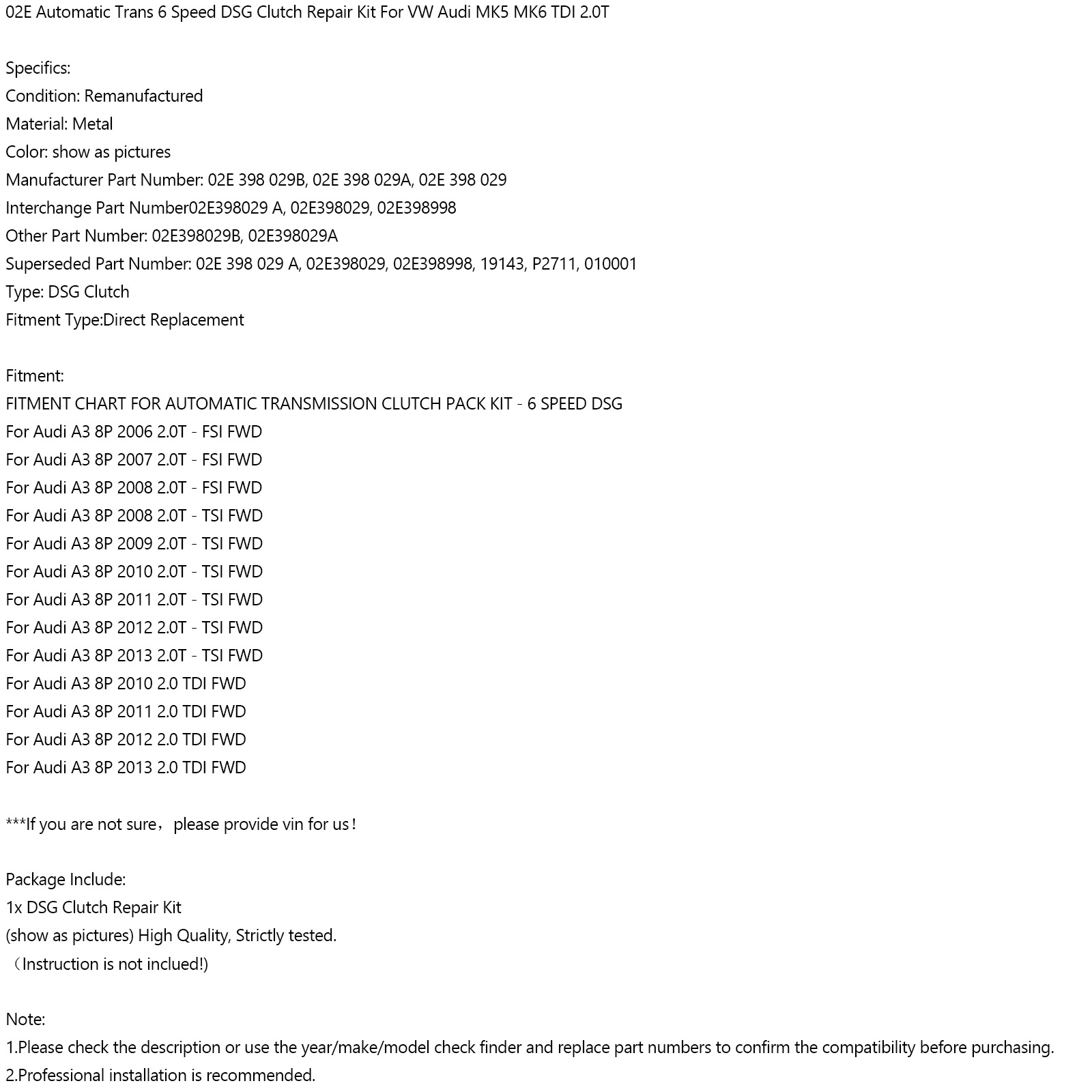 -  -  -  -  -  -  -  -  -  -  -  -  -  -  -  -  -  -  -  -  -  -  Product Description Please kindly note: This item is **Refurbished Parts**, not Brand New. To ensure compatibility, we recommend providing your ①VIN, ②OE Number, ③The clear photo of your original part if possible. Auto parts are highly complex, and this information helps us confirm the correct fit. Thank you so much! 02E Automatic Trans 6 Speed DSG Clutch Repair Kit For VW Audi MK5 MK6 TDI 2.0T Feature: 1: According to the original factory specifications,perfect match for the original car. 2: Own different test machines to design exact accurate parameter for our products.All items were tested for performance. 3: Made by high quality material, lightweight, anti-rust, colorfast and durable. 4: Aftermarket product with premium quality. 5: Stable performance, high reliability,suitable for replacing your broken one. Specifics: Condition: Remanufactured Material: Metal Color: show as pictures Manufacturer Part Number: 02E 398 029B, 02E 398 029A, 02E 398 029 Interchange Part Number02E398029 A, 02E398029, 02E398998 Other Part Number: 02E398029B, 02E398029A Superseded Part Number: 02E 398 029 A, 02E398029, 02E398998, 19143, P2711, 010001 Type: DSG Clutch Fitment Type:Direct Replacement Fitment: FITMENT CHART FOR AUTOMATIC TRANSMISSION CLUTCH PACK KIT - 6 SPEED DSG For Audi A3 8P 2006 2.0T - FSI FWD For Audi A3 8P 2007 2.0T - FSI FWD For Audi A3 8P 2008 2.0T - FSI FWD For Audi A3 8P 2008 2.0T - TSI FWD For Audi A3 8P 2009 2.0T - TSI FWD For Audi A3 8P 2010 2.0T - TSI FWD For Audi A3 8P 2011 2.0T - TSI FWD For Audi A3 8P 2012 2.0T - TSI FWD For Audi A3 8P 2013 2.0T - TSI FWD For Audi A3 8P 2010 2.0 TDI FWD For Audi A3 8P 2011 2.0 TDI FWD For Audi A3 8P 2012 2.0 TDI FWD For Audi A3 8P 2013 2.0 TDI FWD For Audi A3 8P 2006 3.2L V6 Quattro For Audi A3 8P 2007 3.2L V6 Quattro For Audi A3 8P 2008 3.2L V6 Quattro For Audi A3 8P 2009 3.2L V6 Quattro For Audi A3 8P 2009 2.0T - TSI Quattro For Audi A3 8P 2010 2.0T - TSI Quattro For Audi A3 8P 2011 2.0T - TSI Quattro For Audi A3 8P 2012 2.0T - TSI Quattro For Audi A3 8P 2013 2.0T - TSI Quattro For Audi A3 8V 2014+ 1.8T FWD For Audi A3 8V 2014+ 2.0T Quattro For Audi A3 8V 2014+ 2.0 TDI FWD For Audi TT MK1 2004 3.2L V6 Quattro For Audi TT MK1 2005 3.2L V6 Quattro For Audi TT MK3 2014 + 2.0T Quattro For Audi TT Convertible MK2 2008 3.2L V6 Quattro For Audi TT Convertible MK2 2009 3.2L V6 Quattro For Audi TT MK2 2008 2.0T FSI FWD For Audi TT MK2 2009 2.0T FSI FWD For Audi TT MK2 2009 2.0T TSI FWD For Audi TT Convertible MK2 2008 2.0T TSI FWD For Audi TT Convertible MK2 2009 2.0T TSI FWD For Audi TT MK2 2011 2.0T TFSI Quattro For Audi TT MK2 2012 2.0T TFSI Quattro For Audi TT MK2 2013 2.0T TFSI Quattro For Audi TT Convertible MK2 2012 2.0T TFSI Quattro For Audi TT Convertible MK2 2013 2.0T TFSI Quattro For Audi TT MK2 2008 3.2L V6 Quattro For Audi TT MK2 2009 3.2L V6 Quattro For Audi TT MK2 2009 2.0T TTS Quattro For Audi TT MK2 2010 2.0T TTS Quattro For Audi TT MK2 2011 2.0T TTS Quattro For Audi TT MK2 2012 2.0T TTS Quattro For Audi TT MK2 2013 2.0T TTS Quattro For Audi TT Convertible MK2 2009 2.0T TTS Quattro For Audi TT Convertible MK2 2010 2.0T TTS Quattro For Audi TT Convertible MK2 2011 2.0T TTS Quattro For Audi TT Convertible MK2 2012 2.0T TTS Quattro For Audi TT Convertible MK2 2013 2.0T TTS Quattro For Audi TT MK2 2012 2.5T TTRS Quattro For Audi TT MK2 2013 2.5T TTRS Quattro For Volkswagen New Beetle Convertible 2004 1.8T FWD For Volkswagen New Beetle Convertible 2005 1.8T FWD For Volkswagen New Beetle 2004 1.8T FWD For Volkswagen New Beetle 2005 1.8T FWD For Volkswagen New Beetle Convertible 2004 2.0L FWD For Volkswagen New Beetle Convertible 2005 2.0L FWD For Volkswagen New Beetle Convertible 2006 2.5L FWD For Volkswagen New Beetle 2012 + 1.8T Gen 3 FWD For Volkswagen New Beetle 2012 + 2.0T FWD For Volkswagen New Beetle 2012 + 2.0T Gen 3 FWD For Volkswagen New Beetle 2012 + 2.5L FWD For Volkswagen New Beetle 2012 + TDI FWD For Volkswagen CC 2010 2.0T TSI FWD For Volkswagen CC 2011 2.0T TSI FWD For Volkswagen CC 2012 2.0T TSI FWD For Volkswagen CC 2013 2.0T TSI FWD For Volkswagen CC 2014 2.0T TSI FWD For Volkswagen CC 2010 3.6L FWD For Volkswagen CC 2013 3.6L FWD For Volkswagen CC 2014 3.6L FWD For Volkswagen CC 2010 3.6L 4 Motion For Volkswagen CC 2011 3.6L 4 Motion For Volkswagen CC 2012 3.6L 4 Motion For Volkswagen CC 2013 3.6L 4 Motion For Volkswagen CC 2014 3.6L 5 Motion For Volkswagen EOS 2007 2.0T - FSI FWD For Volkswagen EOS 2008 2.0T - FSI FWD For Volkswagen EOS 2009 2.0T - FSI FWD For Volkswagen EOS 2009 2.0T - TSI FWD For Volkswagen EOS 2010 2.0T - TSI FWD For Volkswagen EOS 2011 2.0T - TSI FWD For Volkswagen EOS 2012 2.0T - TSI FWD For Volkswagen EOS 2013 2.0T - TSI FWD For Volkswagen EOS 2010 2.0T - TSI FWD For Volkswagen EOS 2011 2.0T - TSI FWD For Volkswagen EOS 2012 2.0T - TSI FWD For Volkswagen EOS 2013 2.0T - TSI FWD For Volkswagen EOS 2007 3.2L FWD For Volkswagen EOS 2008 3.2L FWD For Volkswagen EOS 2014 + - - For Volkswagen Golf/GTI MK5 2006 2.0T - FSI FWD For Volkswagen Golf/GTI MK5 2007 2.0T - FSI FWD For Volkswagen Golf/GTI MK5 2008 2.0T - FSI FWD For Volkswagen Golf/GTI MK5 2008 2.0T - TSI FWD For Volkswagen Golf/GTI MK5 2009 2.0T - TSI FWD For Volkswagen Golf/GTI MK5 2008 2.0T - TSI FWD For Volkswagen Golf/GTI MK5 2009 2.0T - TSI FWD For Volkswagen Golf/GTI MK6 2010 2.0T - TSI FWD For Volkswagen Golf/GTI MK6 2011 2.0T - TSI FWD For Volkswagen Golf/GTI MK6 2012 2.0T - TSI FWD For Volkswagen Golf/GTI MK6 2013 2.0T - TSI FWD For Volkswagen Golf/GTI MK6 2010 TDI 2.0 FWD For Volkswagen Golf/GTI MK6 2011 TDI 2.0 FWD For Volkswagen Golf/GTI MK6 2012 TDI 2.0 FWD For Volkswagen Golf/GTI MK6 2013 TDI 2.0 FWD For Volkswagen Golf/GTI MK6 2014 TDI 2.0 FWD For Volkswagen Golf R MK6 2012 2.0T - TSI AWD For Volkswagen Golf R MK6 2013 2.0T - TSI AWD For Volkswagen R32 MK5 R32 2008 VR6 3.2 AWD For Volkswagen Jetta MK5 2006 2.0T - FSI FWD For Volkswagen Jetta MK5 2007 2.0T - FSI