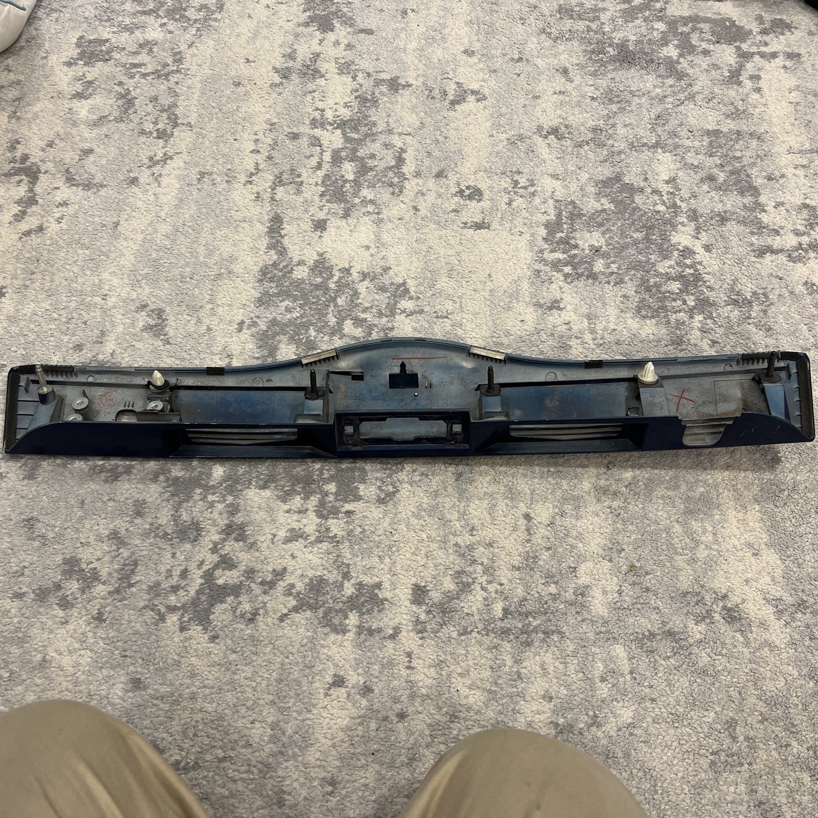 This listing is for hatch garnish or handle out of 2008 Prius. All mounting points are in place and feel sturdy even though one has small crack which I would recommend to reinforce with glue before installation or use it as it is because it’s still feels strong. This is Toyotas dark blue which could use fresh paint as it has scuffs.