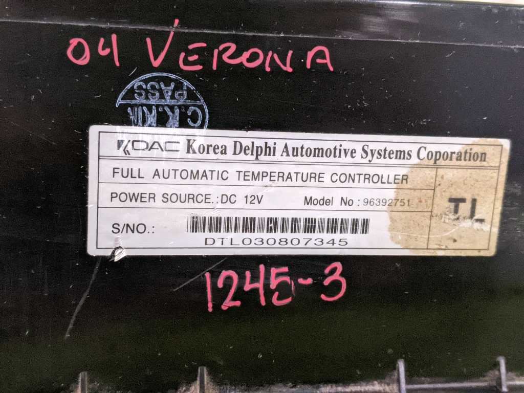 [       ##### Click Thumbnails to Enlarge             Product Description Donor Vehicle:2004 SUZUKI VERONA 2.5L AT SEDANPart Being Sold:DIGITAL TEMPERATURE CLIMATE CONTROL SWITCHPart Number:96392751Item ID:1245-3 \*\*RESIDUE ON LENS\*PN MATCHES EPICA, PULLED FROM VERONA\*\*