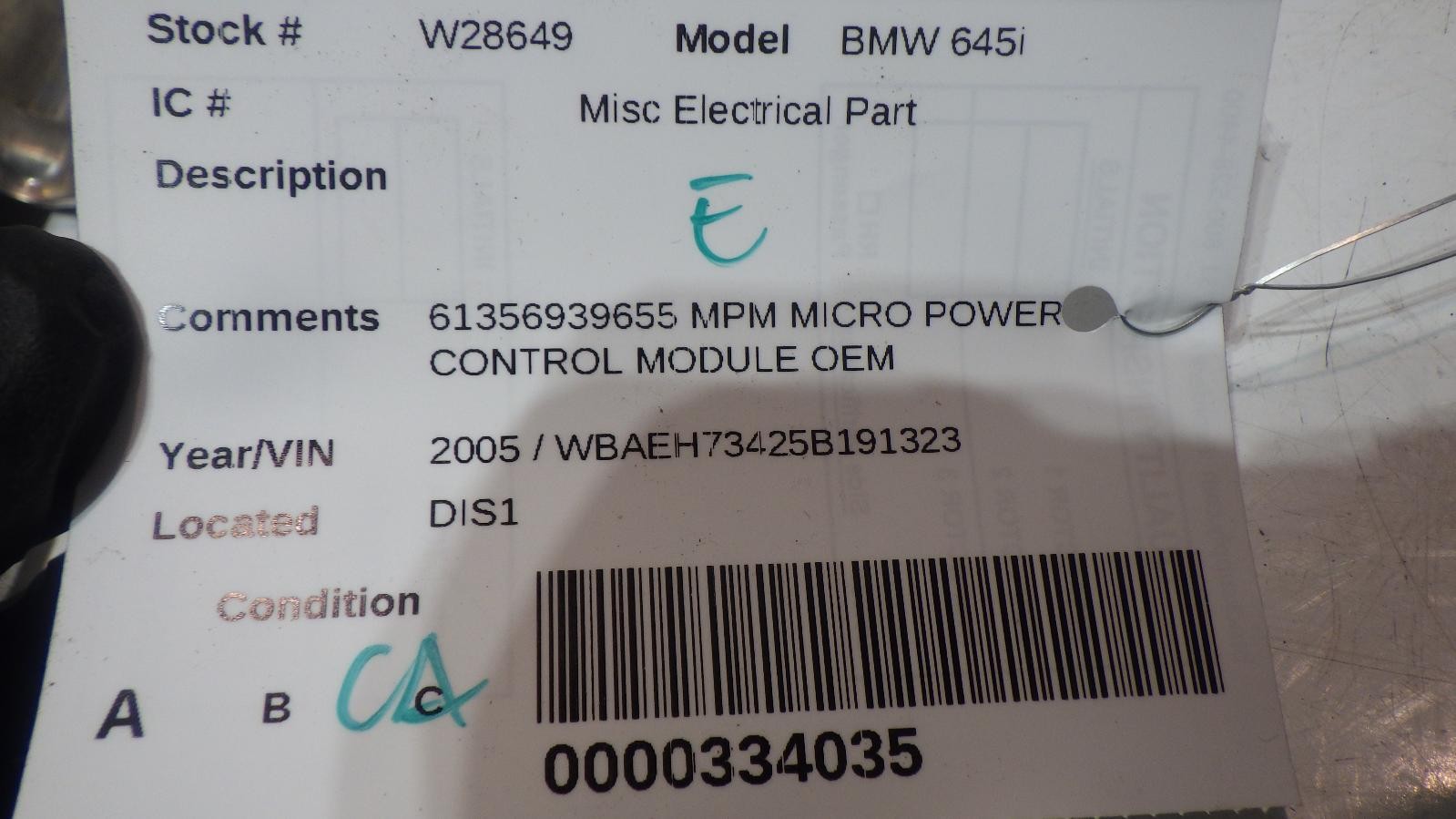 # BMW 645i2005 ### IF YOU ARE FROM ALASKA, HAWAII, PUERTO RICO YOU MUST REQUEST A SHIPPING QUOTE. STANDARD SHIPPING DOES NOT APPLY TO YOU. ## Item Details Make / ModelBMW BMW 645iYear2005Stock NumberW28649VINWBAEH73425B191323Odometer0 Miles km 61356939655 MPM MICRO POWER CONTROL MODULE OEM ## Part also fits ## General Information and Conditions - West Coast Auto - Feel free to contact us in regards to any purchase or if you simply need more INFO ## Shipping and Handling - Ship To Locations Our default shipping rates are for the 48 US states only via UPS Ground or USPS. At an extra charge, Alaska , Hawaii , APO, FPO, Puerto Rico and all US Territories will be sent via USPS Priority Mail. At an extra charge, we will also ship items World Wide International via USPS International Priority mail. Depending on which country you are in, you may need to contact us for a shipping quote before or after purchase to complete the sale. We usually ship within 1-2 business days of receiving cleared payment. Unless otherwise noted, Buyer pays shipping. Freight Items We will not ship freight items and some larger or fragile parts outside of the 48 US states. For large items that must be shipped via Freight Truck (i.e. engines, transmissions, doors, trunks, hoods...etc), the delivery site must be a commercially zoned address capable of unloading a freight truck. Home businesses, churches, military bases, schools, and self storage units cannot be delivered to. We can also arrange for you to pick up your freight item at your local freight terminal. For an accurate residential freight quote, please contact us before your purchase. If for some reason our shipping cost is greatly over this estimate, we reserve the right to ask for additional funds or an alternate ship to address. Shipping Deadlines We will process every order within 24 hours of checkout. Our business hours are from 8-5 M-F PST. Orders placed after 1:00 pm PST cannot be guaranteed shipping that day. All Non-Freight items will be sent via UPS or USPS ground unless given instruction otherwise. If you need 2nd day air or Next day air service please call us directly for best results. You may also add this service during checkout but we can only guarantee shipment of these orders if it is placed before 1:00 PST. All freight items will go out the same day if pulled and the order is placed before 12:00 noon PST. This is providing that we have adequate payment, shipping instructions and phone numbers to process the shipment. ## Payment - We accept Pay Pal, or most major credit cards. If you want to use a personal credit card you can pay through our checkout or please Google us to contact us, 8-5 PST M-F By law, we charge sales tax for items shipped to these states(CALIFORNIA): (8.00%). Tax applies to the subtotal plus any shipping and handling for these states only. No labor warranty is provided. In the event a part sold with a warranty fails to operate within the warranty period we will replace the part(s) with a functionally equivalent part or refund the part purchase price, at our option. No refund on deposits or unwanted special order parts or special "cut" items. To return an item you must contact us within the 14 day period to obtain a RMA number (return material authorization). Original shipping charges and return shipping charges are not refunded. Once you obtain an RMA number, ship the item back to WEST COAST AUTO DISMANTLING, (Google us for info) along with the RMA number. - Parts Covered by Warranty – in case the part sold fails to work due to defective material or wrong fitment, we will replace the part or issue a full refund (our choice) up to the cost of the part purchased price (no refunds for labor costs), see warranty tab in the listing for more details. - Items NOT Covered by Warranty - For parts that are not defective, but are returned, the following will apply: 20% Restocking Fee, shipping costs are not refunded, and customer pays for shipping the part back ## Item Location and Contact Information West Coast Auto Dismantling