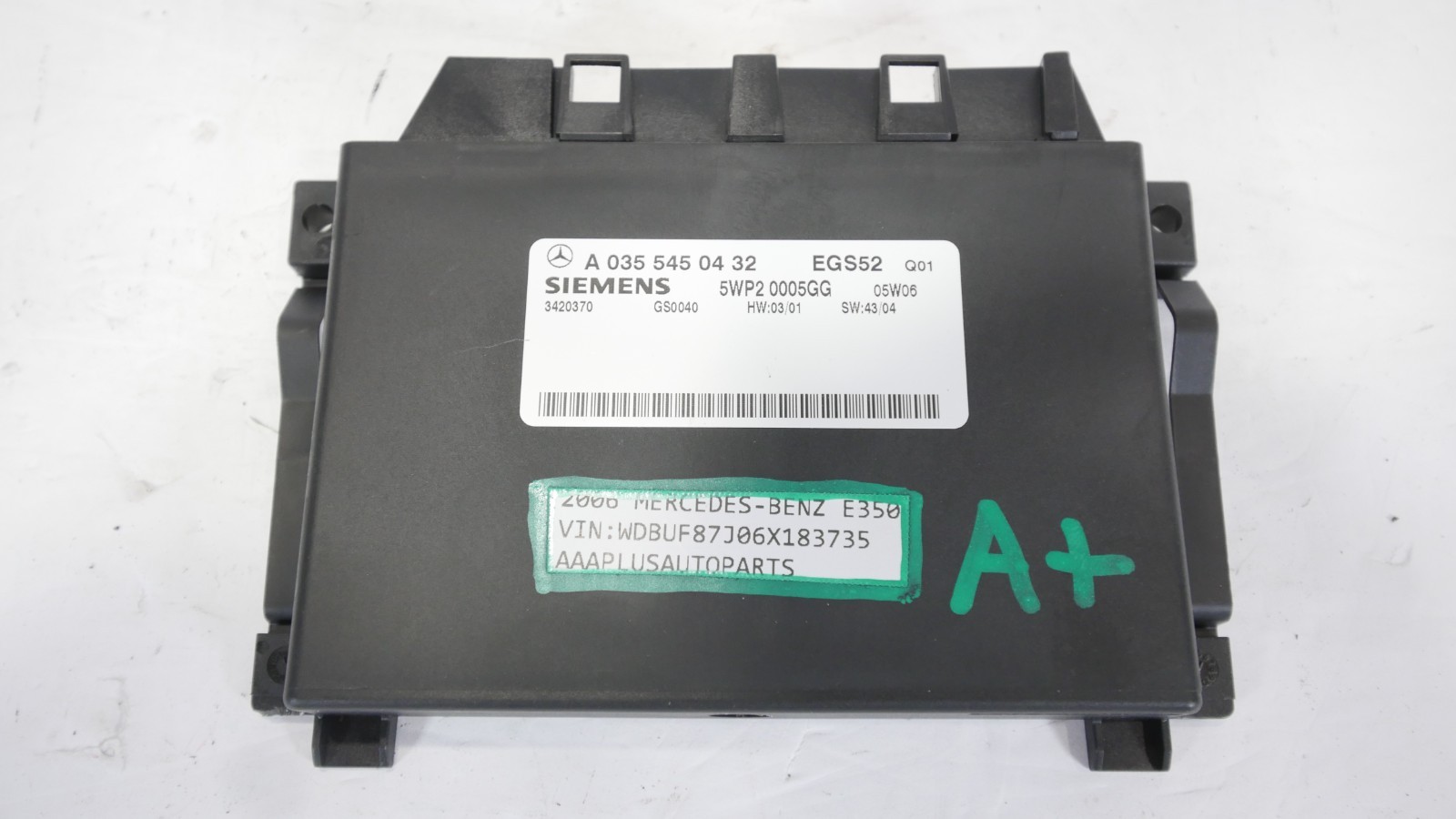 **๐ฉ 2006โ2007 Mercedes-Benz W211 E350 4MATIC Transmission Control Unit (TCU) โ OEM** **Part #:** 035 545 04 32 (A 035 545 04 32) **Vehicle Removed From:** 2006 Mercedes-Benz E350 4MATIC **VIN:** WDBUF87J06X183735 **Condition:** Tested โข Cleaned & Sanitized โข 30 Day Warranty โข Free Returns **Note:** Specifically for **4MATIC (All-Wheel Drive)** models with the **722.6 5-Speed** transmission. * * * **๐ง Item Description** - Genuine Mercedes-Benz OEM **Electronic Transmission Control (EGS/TCU)** module. - Fits **W211 E-Class** 4MATIC models (2006โ2007). - Manages shift points, torque converter lock-up, and diagnostic monitoring for the transmission. - Ideal replacement for units suffering from "Limp Mode," communication errors, or fluid contamination (oil wicking). **โ Functionality & Testing** - โ๏ธ **Diagnostic Scan:** Verified via Xentry/DAS; no internal memory faults or processor errors. - โ๏ธ **Shift Logic:** Tested in a running vehicle to ensure correct gear engagement and smooth adaptation. - โ๏ธ **CAN-Bus:** Verified full communication with the Engine ECU and Instrument Cluster. - โ๏ธ **Electrical:** Connector pins are perfectly straight and free of transmission fluid residue. **๐งผ Condition & Inspection** - Professionally cleaned and sanitized. - **Internal:** Inspected for **oil wicking** damage; the circuit board is bone-dry and free of contaminants. - **Housing:** Plastic casing and mounting tabs are in perfect condition. - **Connectors:** Plug ports are clear of debris and ready for installation. **๐ Vehicle Compatibility** **Mercedes-Benz E350 4MATIC (W211)** - 2006โ2007 Mercedes-Benz E350 4MATIC (Sedan & Wagon) - **Note:** This unit is for the **5-speed 722.6 transmission** found in 4MATIC models. It will **not** fit Rear-Wheel Drive (RWD) models equipped with the 7-speed 722.9 transmission. Always match part number **035 545 04 32**. **โ๏ธ Features & Benefits** - **Genuine Mercedes Part:** Ensures the precise shifting characteristics and fuel economy intended by the factory. - **Plug-and-Play (mostly):** Unlike the later 7-speed units, these 5-speed TCUs are generally not "theft-relevant," but may require coding to match your vehicle's specific axle ratio. **๐ฉ Installation Notes** - Located in the **passenger side footwell** (under the carpet, behind the metal kickplate). - **Crucial Tip:** If your old unit failed due to oil contamination, you **must** replace your **transmission 13-pin connector plug/bushing** and clean the wiring harness, or oil will wick into this new unit and destroy it. **๐ก๏ธ Warranty & Returns** - โ๏ธ **30 Day Warranty** โ Guaranteed electronic and shifting functionality. - โ๏ธ **Free Returns** โ Shop with total confidence. - โ๏ธ **Tested & Cleaned**
