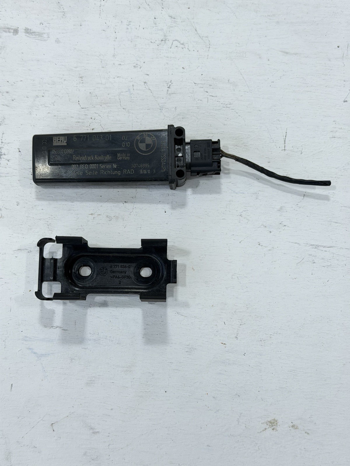 **The product is an OEM BMW tire pressure control module unit TPMS RDC designed for models 335i, 528i, and 750li from 2006 to 2013. It is a direct replacement part made of plastic and manufactured in Germany. The sensor type is a tire pressure monitoring sensor, and it comes with the OE/OEM part number 36236771043, 6771043-01, and 6 771 043. This unit is easy to install and is positioned on the front of the vehicle.**