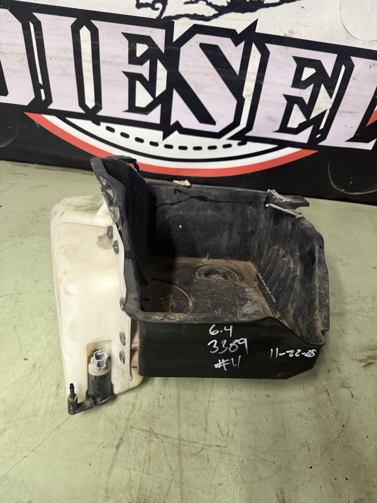 Pre owned battery tray / windshield washer fluid tank for 2008 2009 2010 ford f-250 f-350 f-450 6.4L power stroke turbo diesel applications. Part # 8C34-10748-AG