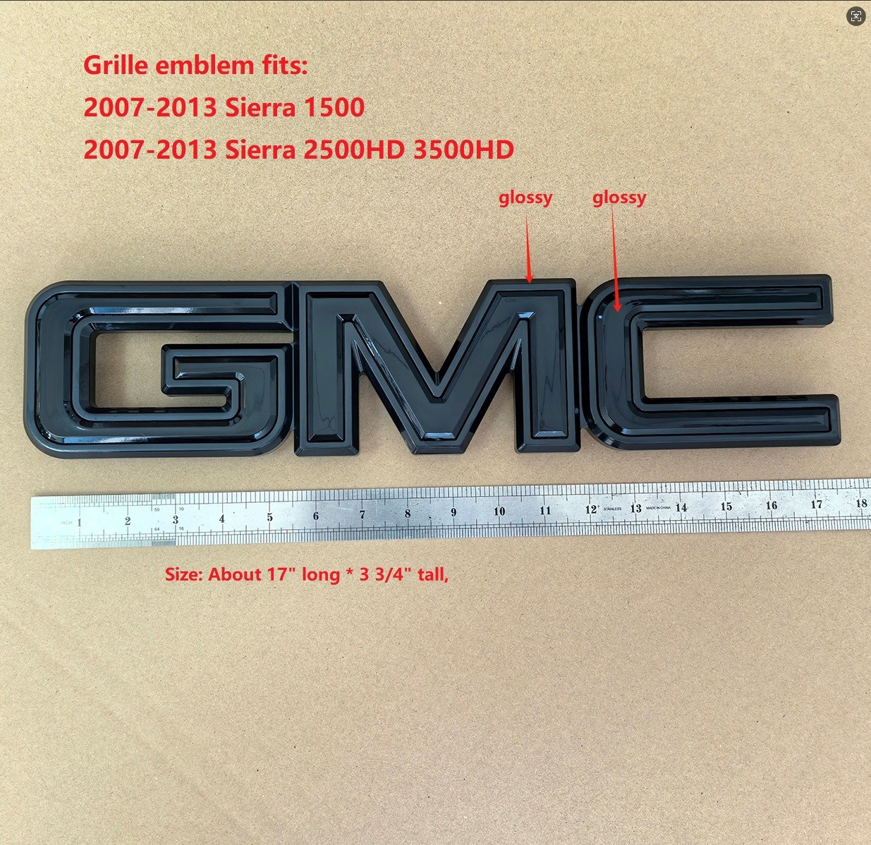 **Set OEM Sierra Front Grille Emblems made for :** - **2007-2013 GMC Sierra 1500** - **2007-2013 GMC Sierra 2500HD** - **2007-2013 GMC Sierra 3500HD** Features: 1.100% brand 3D new and High quality. 2\. This is Real 3D emblem and NOT just a thin stickers, Not overlay emblem, 3.Easy to install to your grill and Tailgate,if you have any problem,please ask us for helping. Color: As the first picture.All gloss Black Individual letters - Whole Emblem Size: About 17" long \*3 3/4" tall, Package Include: You can get it as the first picture.