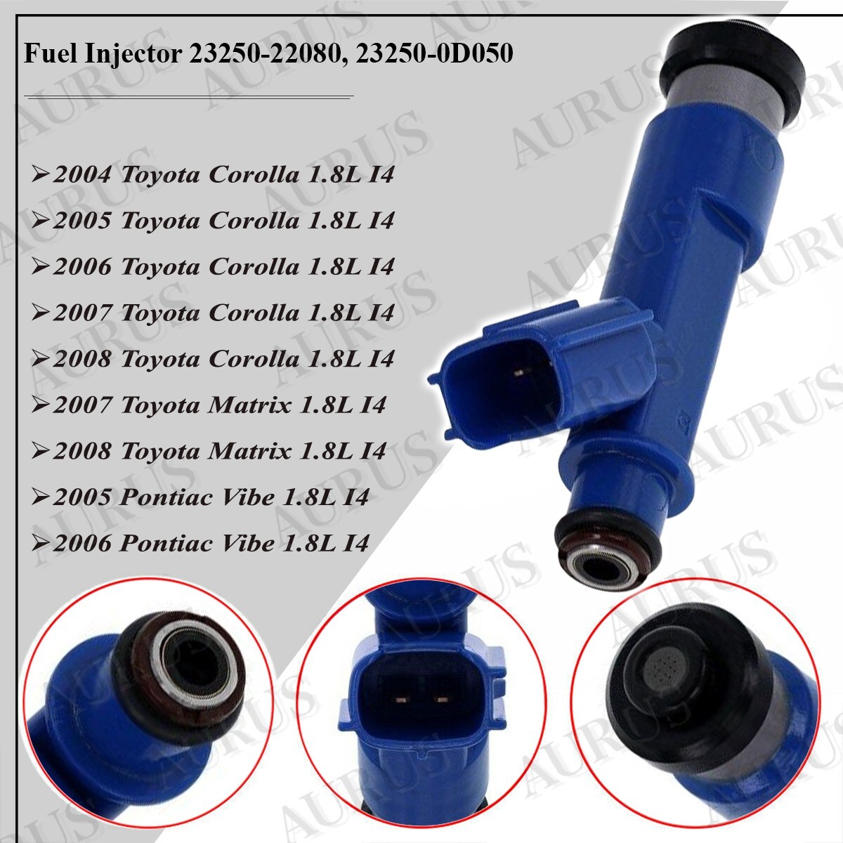 **AURUS** **_Injecting power, enhancing performance with a LIFETIME WARRANTY_** _Since online marketplaces are flooded with cheap knockoff auto parts, which will cause engine damage and way more expenses, we highly recommend buying fuel injectors from a reputable company as we are!!!_ Aurus auto parts manufacturing, re-manufacturing and distribution company is pleased to introduce a set of a single **1** **-piece**Genuine**DENSO**OEM part number**23250-22080, 23250-0D050** re-manufactured fuel injector for the vehicles mentioned below - **2004 Toyota Corolla 1.8L I4** - **2005 Toyota Corolla 1.8L I4** - **2006 Toyota Corolla 1.8L I4** - **2007 Toyota Corolla 1.8L I4** - **2008 Toyota Corolla 1.8L I4** - **2007 Toyota Matrix 1.8L I4** - **2008 Toyota Matrix 1.8L I4** - **2005 Pontiac Vibe 1.8L I4** - **2006 Pontiac Vibe 1.8L I4** **_Our_** **_Remanufacturing process:_** _All injectors have undergone through refurbishment process to restore it to like-new condition._ _Here’s what happens during remanufacturing:_ 1. _**Core Selection & Disassembly**_: We carefully select worn-out fuel injector cores that can be restored. All selected cores are dissembled carefully, separating various components of the fuel injector, including the nozzle, valve and body. 2. **_Cleaning:_** All components are subjected to a rigorous cleaning process to remove any built-up deposits, carbon residues, or contaminants. 3. _**Inspection:**_ Each component is closely examined for wear, damage, or signs of corrosion. Any parts that do not meet the required specifications are replaced. 4. **_Replacement of Worn Parts_ _:_** Damaged or worn components like o-rings, seals, filters, spacers, springs, caps are replaced with new OEM high-quality parts. 5. _**Testing:**_ Remanufactured injectors go through a series of tests to ensure they meet factory standards. This includes ultrasonic cleaning, flow testing and matching +-2%, leak testing and spray pattern analysis to ensure proper fuel delivery. 6. _**Calibration:**_ The injectors are calibrated to ensure they deliver the correct amount of fuel at the right pressure and spray pattern for optimal engine performance. 7. **_Assembly_ _:_** Once all components pass inspection and testing, they are reassembled into a complete fuel injector. **Our re-manufactured fuel injectors offer several advantages, including cost savings compared to brand new injectors. We are also environmentally friendly, as we recycle and refurbish existing components, reducing the need for new manufacturing. We recommend purchasing re-manufactured fuel injectors from a reputable supplier like we are to ensure the quality and performance of the fuel injectors meet industry standards and the requirements of your vehicle.** **_Warranty and Returns:_** _Forever Quality, Forever Warranty is our promise._ **_Our Lifetime unlimited warranty_** typically covers defects in materials and workmanship. If a covered defect arises, we will either repair the product or replace it with the same type of product. Please save proof of purchase such as receipt or invoice to claim warranty service. **_Note:_** Our lifetime warranty does not apply to misuse, damages caused by wrong installation and accidents. **_We provide 30-day hassle-free returns_.** Products must be returned in unused/uninstalled condition **.** **We have a professional technician’s team who are ready to assist you with any issues. **_Packaging:_** The re-manufactured fuel injectors are packaged and labeled, ready for sale and distribution. 2. **_Shipping time:_** We offer same or 24-hour free nationwide or paid international shipping via USPS, UPS, DHL and FedEx. Expedited, Priority and Overnight services are available on check out for an extra fee. Our nationwide free shipped packages usually arrive within 3-5 business days. **We highly recommend the injectors to be installed by a professional technician!**