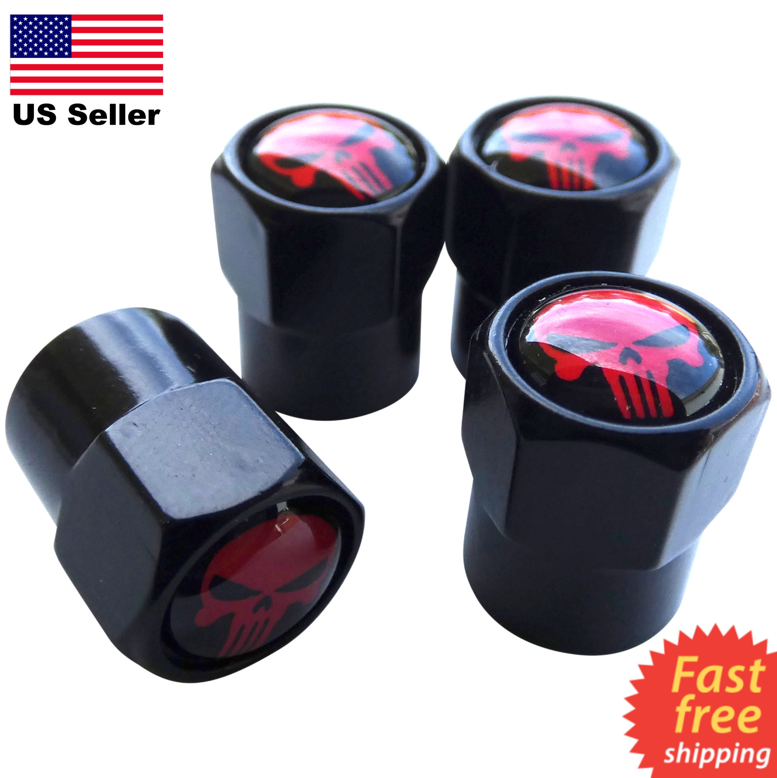 **1 Set of Punisher Tire Valve Stem Caps For Car, Truck Standard Fitting** Quantity: 4 pieces total (for 1 car) Size: 0.5" x 0.31" **Features** **Dust Proof Tire Cap** Wheel Tire Valve Caps can protect the stem valve against exposure to dirt and dust. These heavy-duty tire caps help prevent air leaks and stop dust, dirt, and unwanted objects from damaging the tire cores **Durable Material** This high-quality aluminum alloy/copper tire valve caps help prevent air leaks and prevent dust, dirt, and unwanted objects from damaging the tire cores. **Easy to Install** Installation is super easy. Simply screw tire caps onto tire valve stem (no tools required). Easy to remove when needed. **Applications** Universal size fits all cars, trucks, bikes, motorcycle, ATV, UTV, etc with a standard valve stem. Drive your car with style. Note: Small items, please keep away from children under 3 yrs. **Fast Free Shipping** All orders come with free shipping and are shipped within 12-24 hours (except on Sundays).