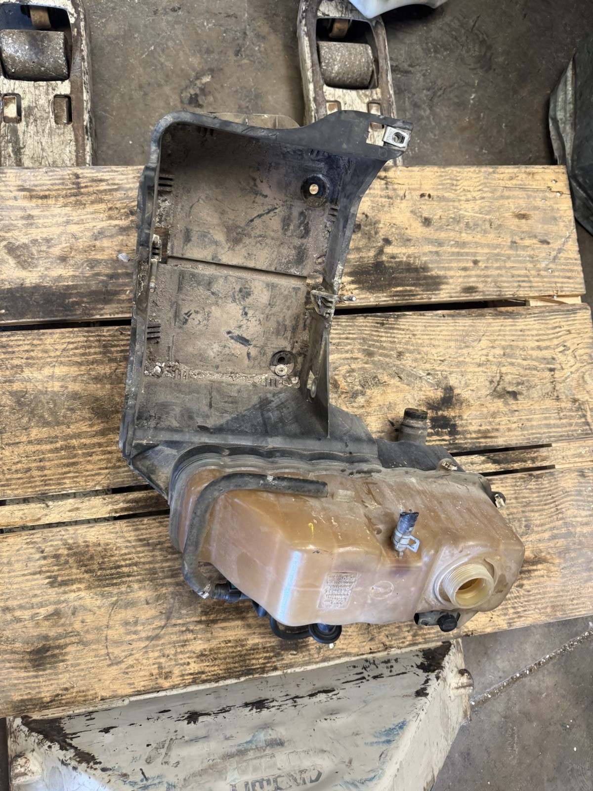 Pre owned battery tray with coolant / overflow tank for 2011 2012 2013 2014 2015 2016 ford f-250 f-350 6.7L power stroke turbo diesel applications. Comes as shown