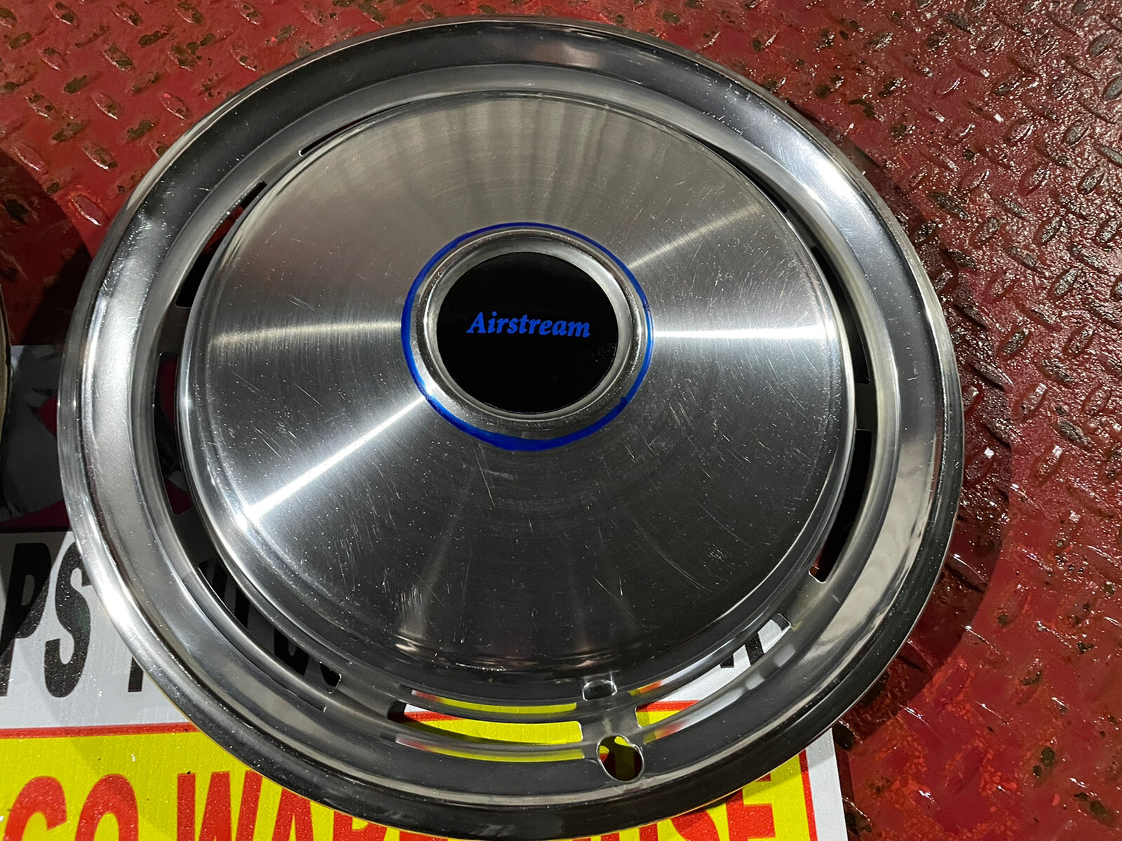 15” Airstream Hubcaps Stainless steel Set-2Trailer Mint Used. These will fit any steel wheels that are 15” they are Stainless steel hubcaps that may have some minor dents and scratches... These will cover ugly black wheel. They have metal mounting clips that hold well.. these are blue in circle , Vynal blue/black , Airstream emblem, with blue circle around middle circles…but look very cool... Shipped with Ups, These are custom made . Not original hubcaps. Will look great on the Airstream!!!!!! Pic of wheel they fit.
