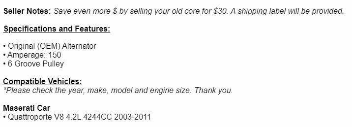 A shipping label will be provided._ **Specifications and Features:** • Original (OEM) Alternator • Amperage: 150 • 6 Groove Pulley **Compatible Vehicles:** _\*Please check the year, make, model and engine size. Thank you._ **Maserati Car** • Quattroporte V8 4.2L 4244CC 2004-2011 104210-1620 **SUPPORT** - Pickup is available on this item, however we cannot give you the exact address or contact information until the purchase is made. You may then call us to arrange a pickup. - If you have any questions, send us a message and we will be glad to help.