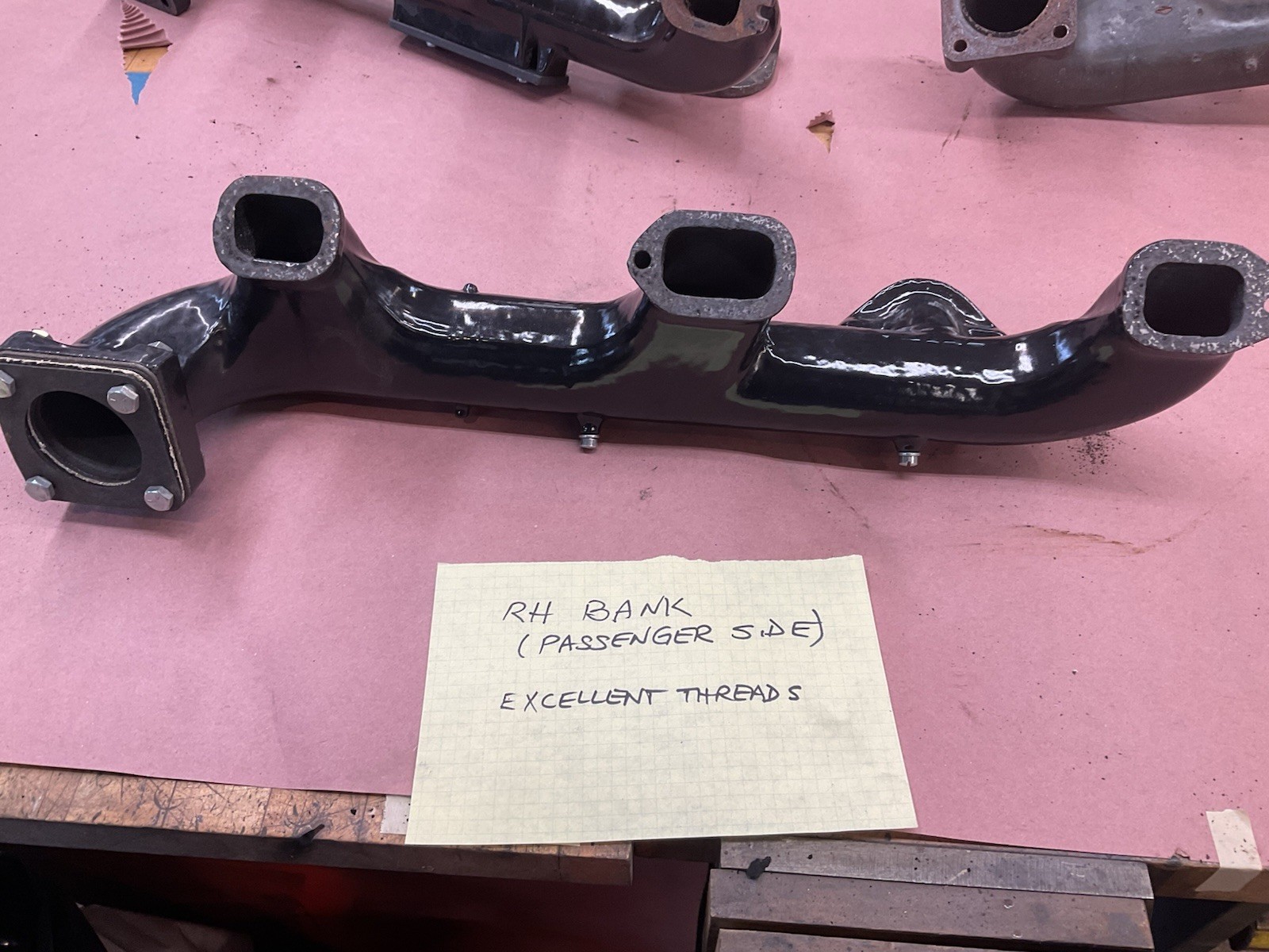 Right hand exhaust manifold. This piece has been refurbished with a new outside finish. It could be either porcelain or some type of ceramic. It is a beautiful piece. All the threaded holes are excellent..