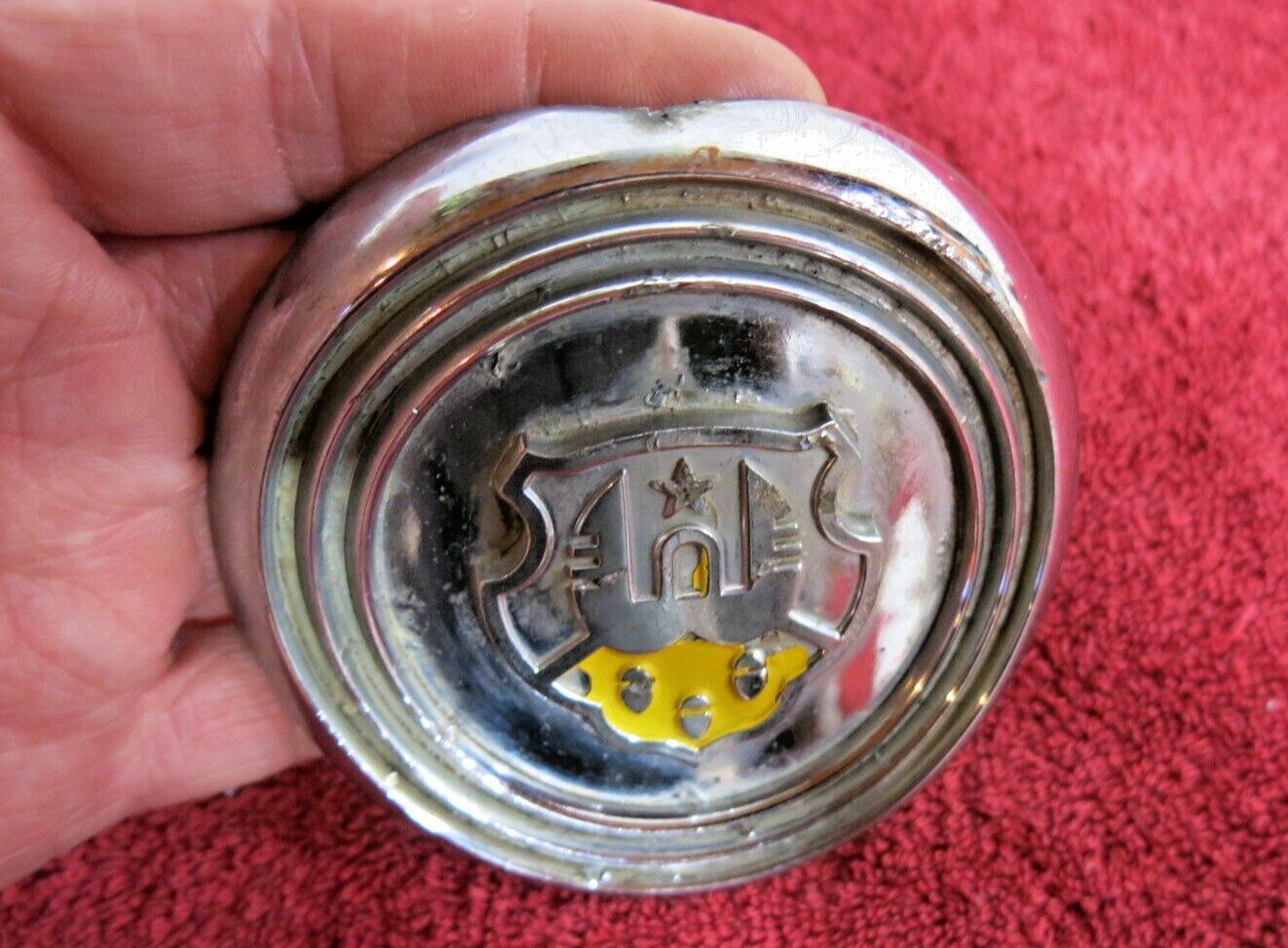 A 1948 Oldsmobile hood grille emblem in very good used condition. Chrome shines bright with just a few pits, it could use a good polishing but displays well as is. No bends breaks or cracks, mounting threads look good and are two inches apart center to center. Missing most of the original paint, measures 3 3/4 inches across from side to side and is 3 5/8 inches tall. 30-day warranty.