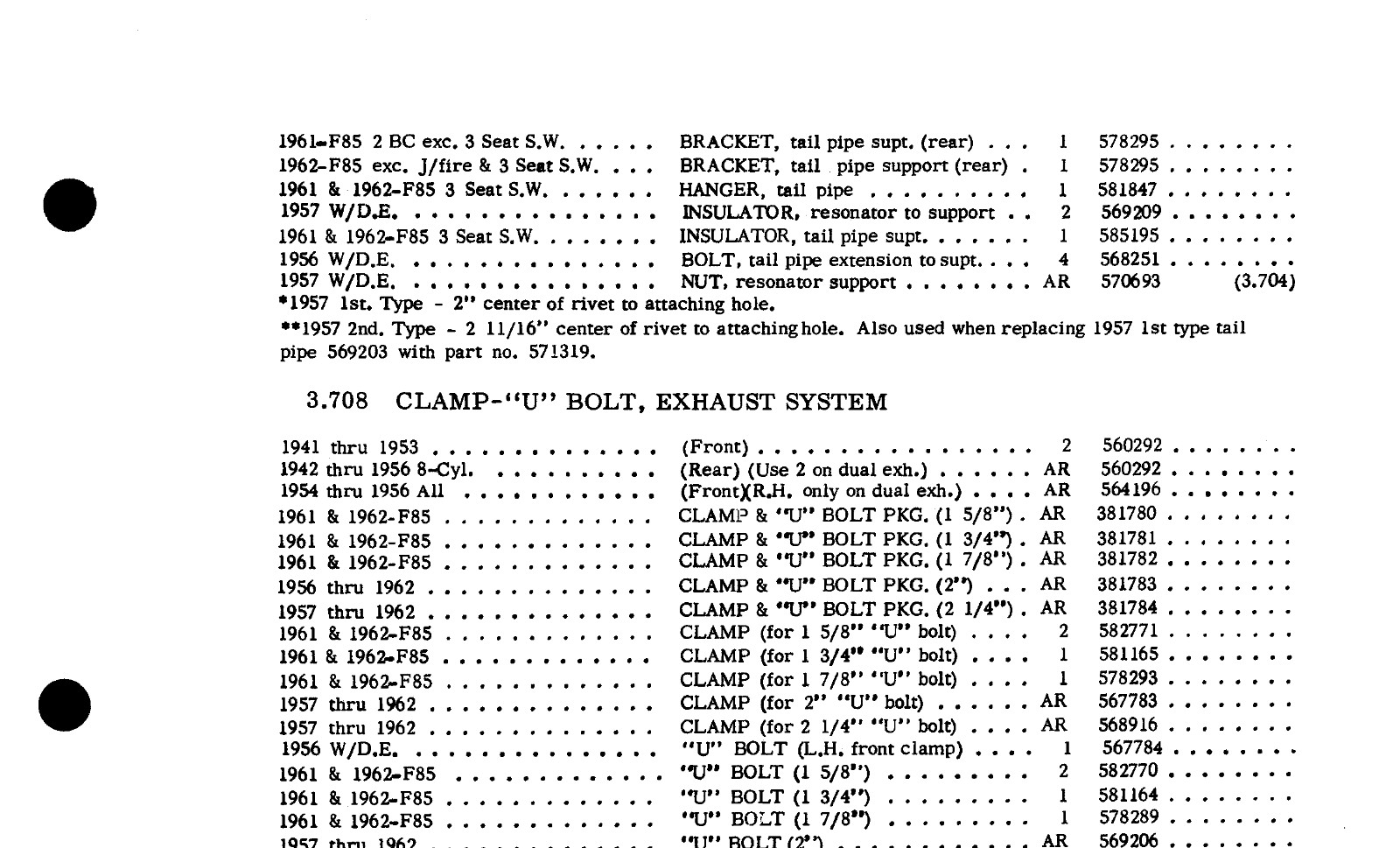 1949-1956 Oldsmobile 88 and 98 Fiesta Starfire V8 Dual Exhaust NOS GM Rear Muffler Hanger Clamp Set. GM part # 560292. This is for 1956 Olds dual exhaust set up and also 1941-1953 Olds FRONT clamps applications. You get 2 (rear left and right) for dual exhaust set up. You can use these for 1949-55 custom dual exhaust set ups with stock size pipes also. Center to center hole size is 3 1/4 inches. . Never installed nos gm hanger. Fusick Automotive Products
