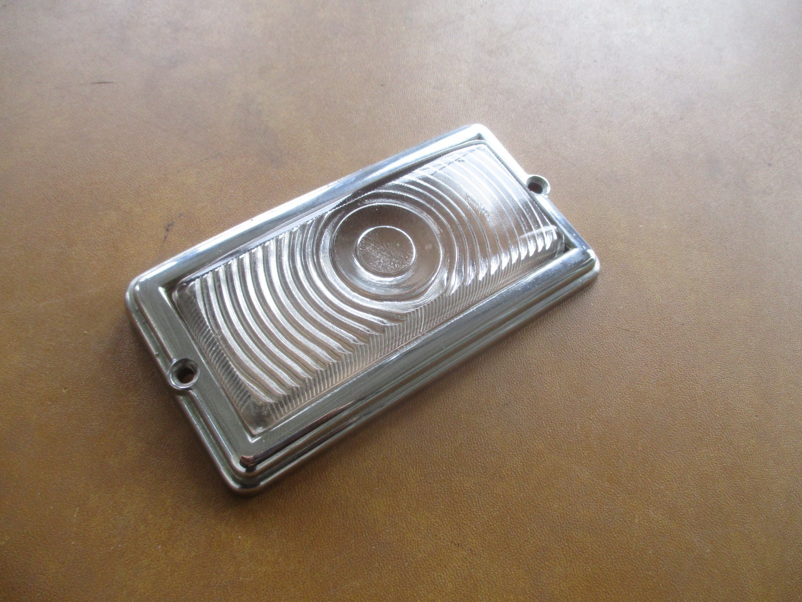 Selling a driver side parking light glass lens & bezel for 1949 Plymouths in good used condition. The bezel is shiny but has some visible pits along the bottom crease that can be seen in the last pic.
