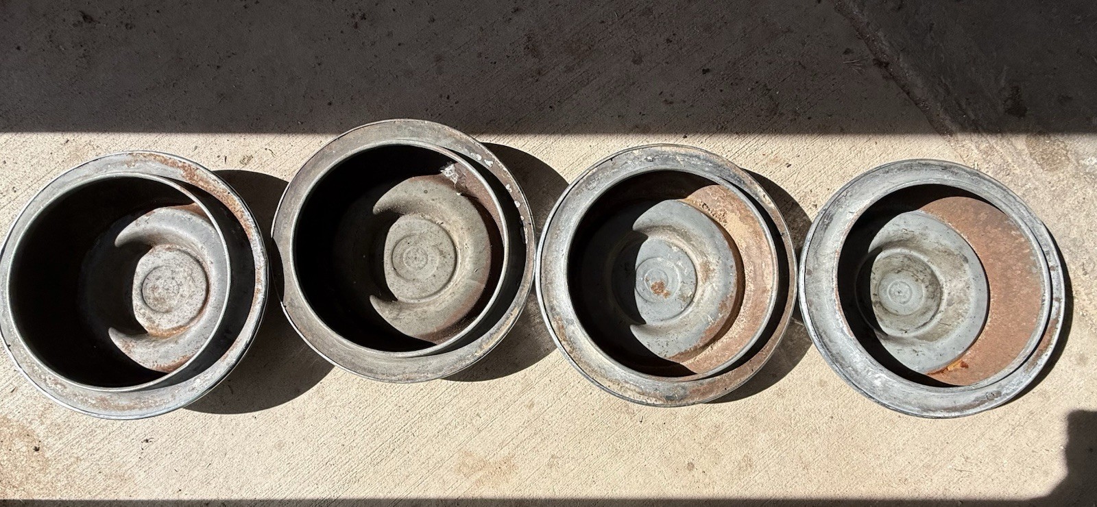 Up for sale is a rare, complete set of four (4) authentic 15-inch vintage hubcaps from the golden era of Oldsmobile (1954-1956). These "World-Wide" globe emblem wheel covers feature the iconic mid-century Saturn-ringed Earth crest, a hallmark of 1950s Rocket Age styling. These are genuine survivor-grade parts with a beautiful, honest patina that provides that sought-after "garage-find" lookâperfect for a period-correct restoration, a custom Rat Rod build, or as high-end automotive wall art for a classic man cave. The steel is solid, and the center emblems remain remarkably clear, showcasing the map of the Americas with vintage character. I am a flexible seller and am happy to discuss custom deals or combined shipping if you are looking to bundle these with other items. Don't miss the chance to own a piece of GM history that truly captures the spirit of the 50s American road.