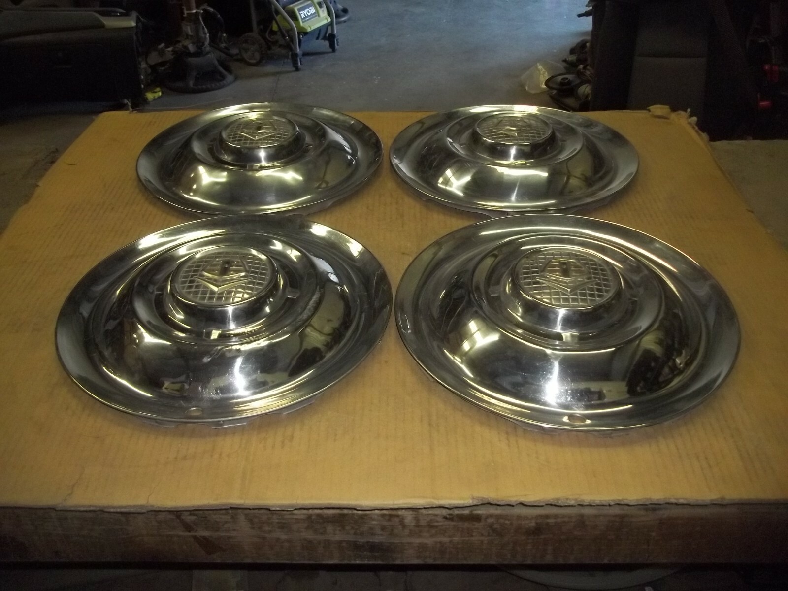 A set of FOUR (4) 1955 Dodge 15" factory full wheel covers.This is a VERY used set with MANY large dings / dents and deep scratches / scrapes.These dings / dents and scratches / scrapes will be noticeable from even a short distance.Entire faces heavily curb damaged with dings and dents.The original finish is VERY faded and worn due to time.Paint peeling and worn completely off.Oxidation and corrosion.Staining that will not polish away.Mounting teeth and drain holes bent out of line with splits but covers attach secure.Bent out of round when laid flat but attach to wheels as designed.Poor driver car quality or only better than none at all.On a scale from 1 to 10, these rate a "5" or less in condition.Buyer to pay shipping with a flat rate of $25 within the continental U.S..Elsewhere there are additional charges.Accept most methods of payment.California buyer to pay state sales tax.