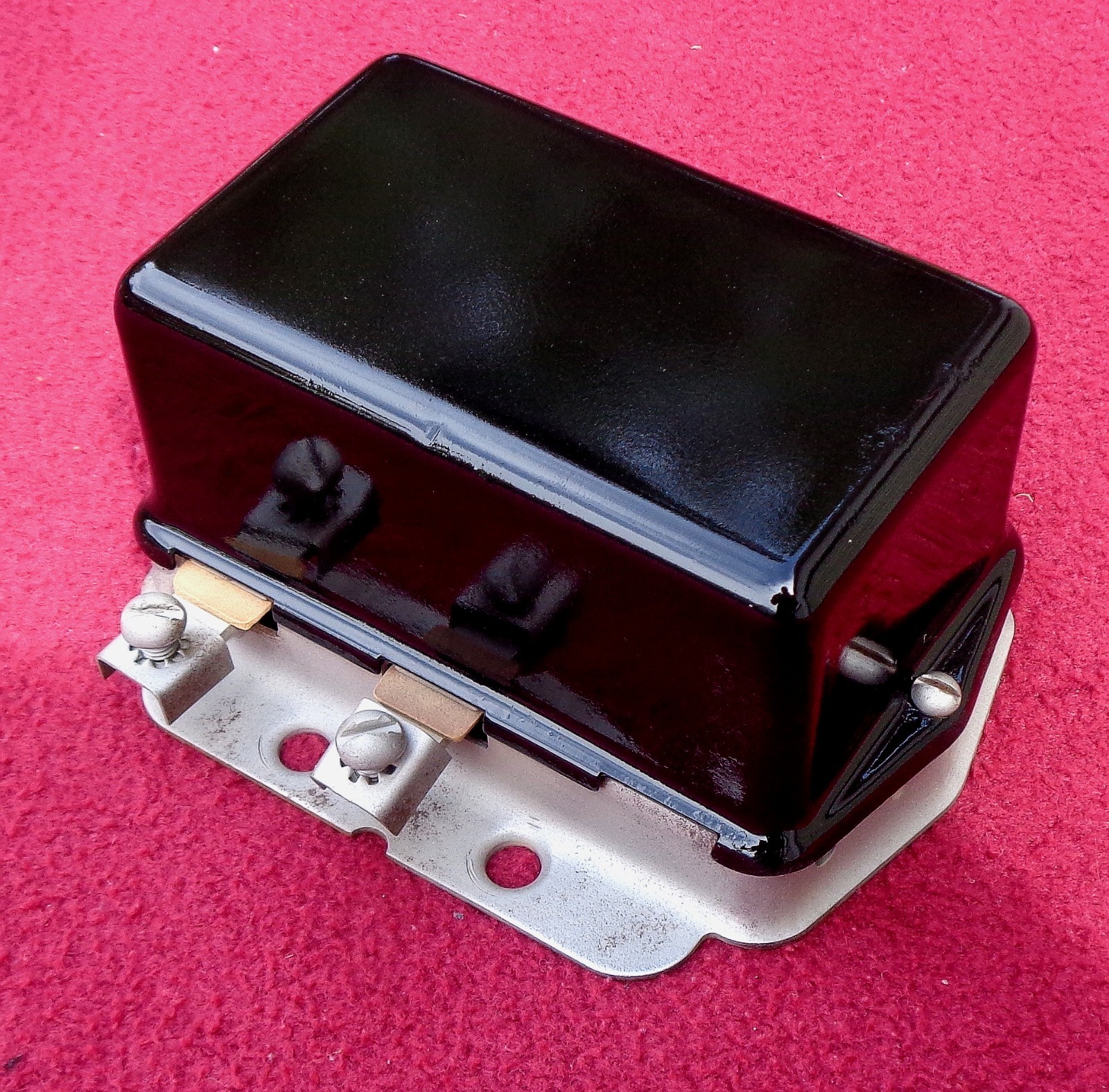 The 1955 Dodge Royal HEMI voltage regulator is a vintage performance part made in the United States. It features a bolt-on mounting style for easy installation and a painted finish for a classic look. This specific voltage regulator is designed for Dodge vehicles, adding to its authenticity and compatibility with the brand. Perfect for car enthusiasts looking to restore or upgrade their vehicle with a piece of automotive history.