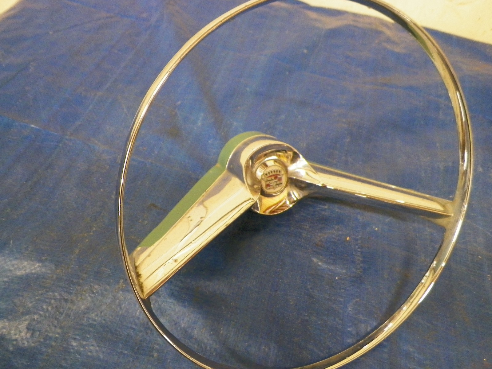 **1957 Cadillac horn ring steering wheel center** **Quite good with some scattered pits. Shiny chrome, very straight, no bends or other defects, nice center shield. Pits are on the flat cross bar with the rim being quite nice.**
