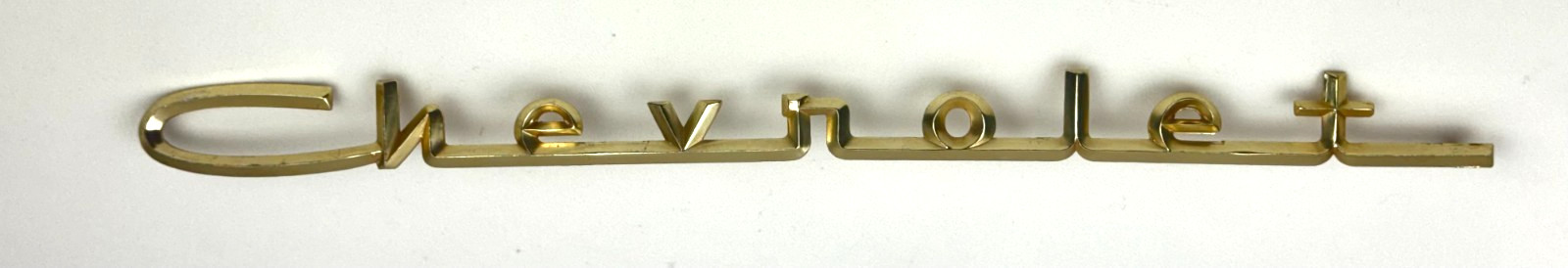 - 1957 Chevrolet Bel Air V8 Gold Hood Trunk Script, Emblem, Badge - In good condition for an original piece. - One mounting tab is broken off - Please look at pictures closely, to see what you would be purchasing. _\*\*\*I have identified these items to the best of my ability. You are purchasing this item as is, so please review pictures thoroughly. I can always send you more pictures if requested. Thank you for your business.\*\*\*_ _S-Deals_ The 1957 Chevrolet Bel Air V8 Gold Hood Trunk Script, Emblem, Badge is a vintage part manufactured by GM in the United States. Made of aluminum, it features a classic design specific to the Chevrolet Bel Air model from 1957. The script, emblem, and badge add a touch of authenticity and nostalgia to the vehicle's exterior, making it a sought-after accessory for car enthusiasts looking to restore or customize their vintage Chevrolet vehicles.