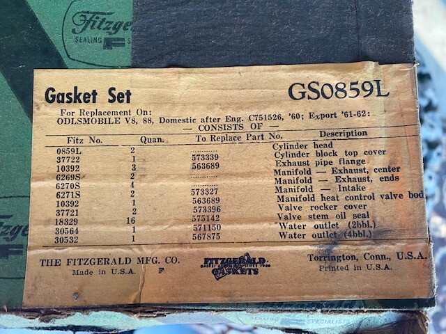 1960 1961 1962 OLDSMOVILE V8 ENGINE GASKET SET FITZGERALD GSO 859L OLDS MOTOR
