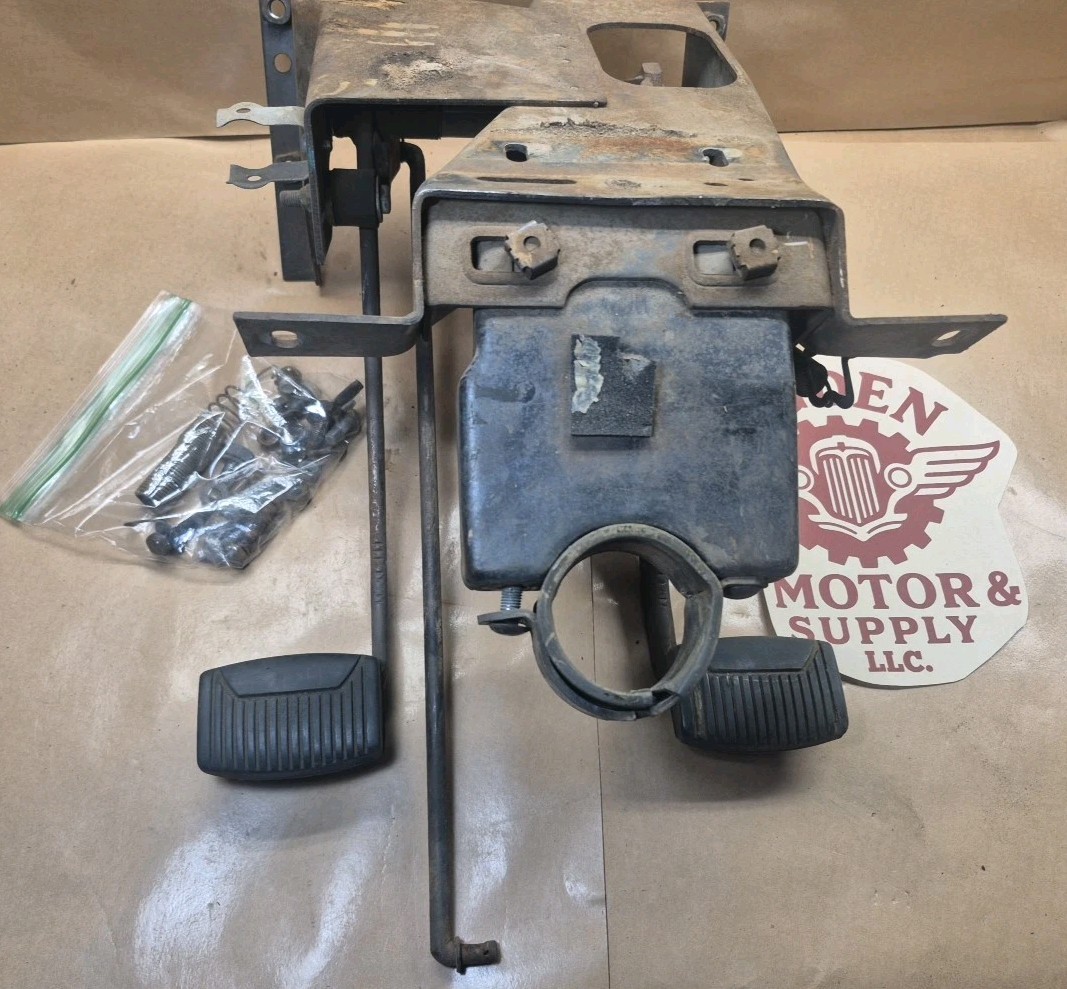This listing is for one used 1961-63 Ford truck Clutch & Brake PEDAL ASSEMBLY. This was removed from a 1963 unibody truck. Also incuded is the clutch rod, steering column hoop that secures the column to the dash and a mostly complete set of mounting bolts. There is quite a bit of wear/play in the joint/socket where the clutch rod hooks into the pedal crank. (See Pics with screwdriver). It is usable but will eventually need to be addressed. The assembly has very minor surface rust only. Questions gladly answered.