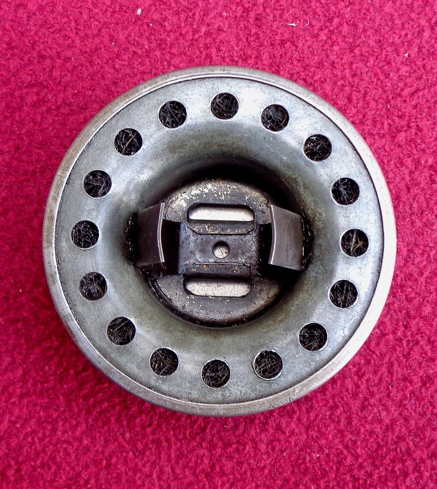 The 1961 Oldsmobile Dynamic 88 stock 394 vented oil cap is a vintage part made of steel in the United States. This silver oil filler cap, designed specifically for Oldsmobile vehicles, adds an authentic touch to any classic car. Perfect for car enthusiasts looking to restore their vintage vehicle to its original condition, this cap brings a piece of automotive history back to life.