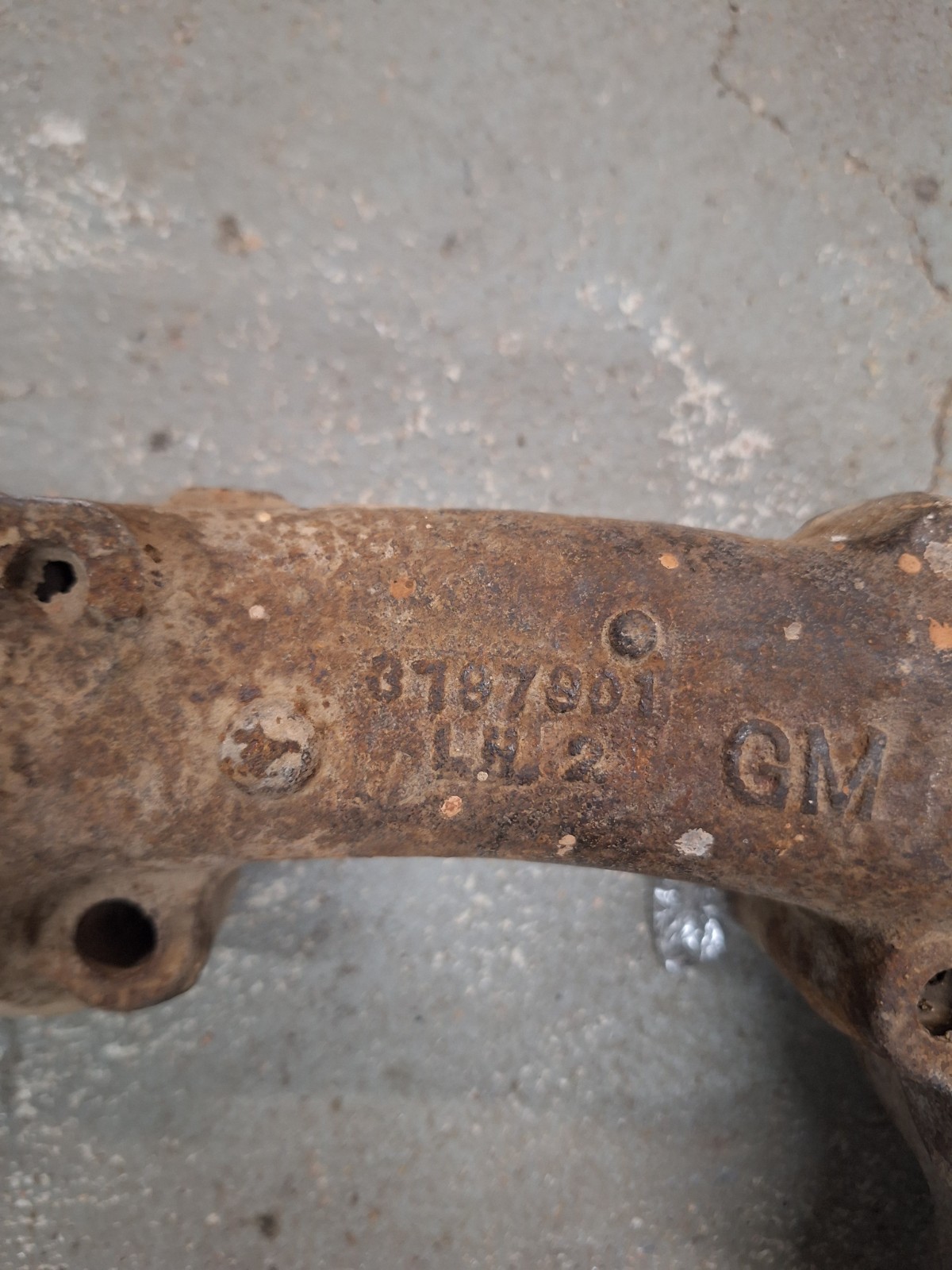 Used manifold no cracks but does have 2 bolts broke off in collector. The product is an OEM GM 3797901 LH 2 1/2" exhaust manifold for a 1962-1963 Corvette. This vintage part is made of cast iron, featuring a bolt-on mounting style for easy installation on the front left side of the vehicle. Manufactured by General Motors in the United States, this performance part is designed for gasoline engines with a SBC cylinder head type. The interchange part number is 3797901, making it a perfect fit for those looking to replace or upgrade their exhaust manifold.